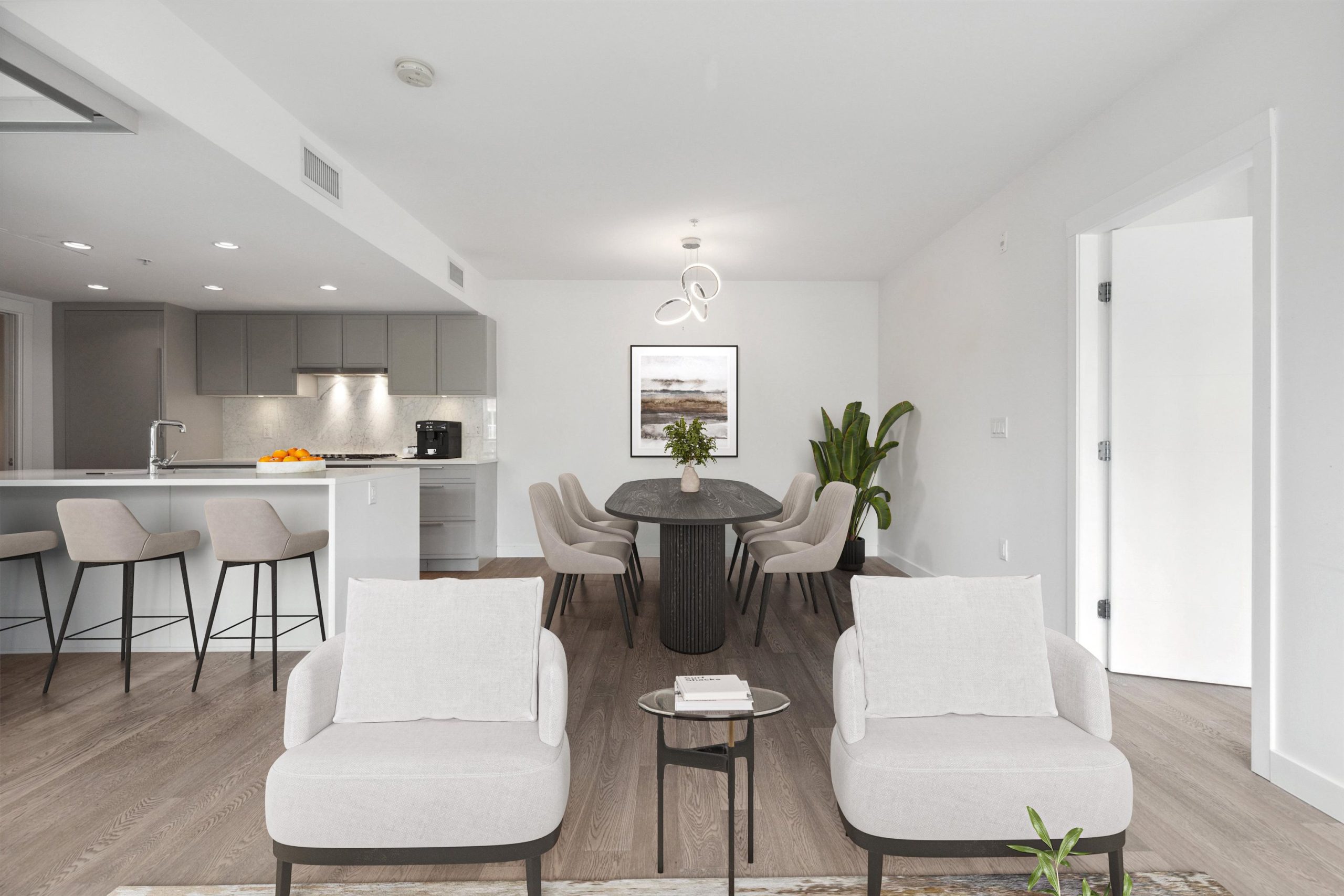 Welcome to the The Leveson – a boutique collection of 39 carefully crafted homes in the community of Marpole. This 2 BED/2 BATH + DEN located on the QUIET SIDE of the building exudes charm / sophistication. Featuring an open-concept layout with floor-to ceiling windows, the interior boasts a contemporary design with impeccable details, including wide-plank engineered hardwood floors throughout, a gourmet kitchen with sleek Caesarstone quartz waterfall countertops, marble backsplashes, and premium integrated Bosch appliances. This unit is also one of only two in the complex that includes a WOK KITCHEN-a rare and valuable feature! Den can be used as guest bdrm. Conveniently located within walking distance to supermarkets, parks, schools etc. 1 parking/1 storage locker.
